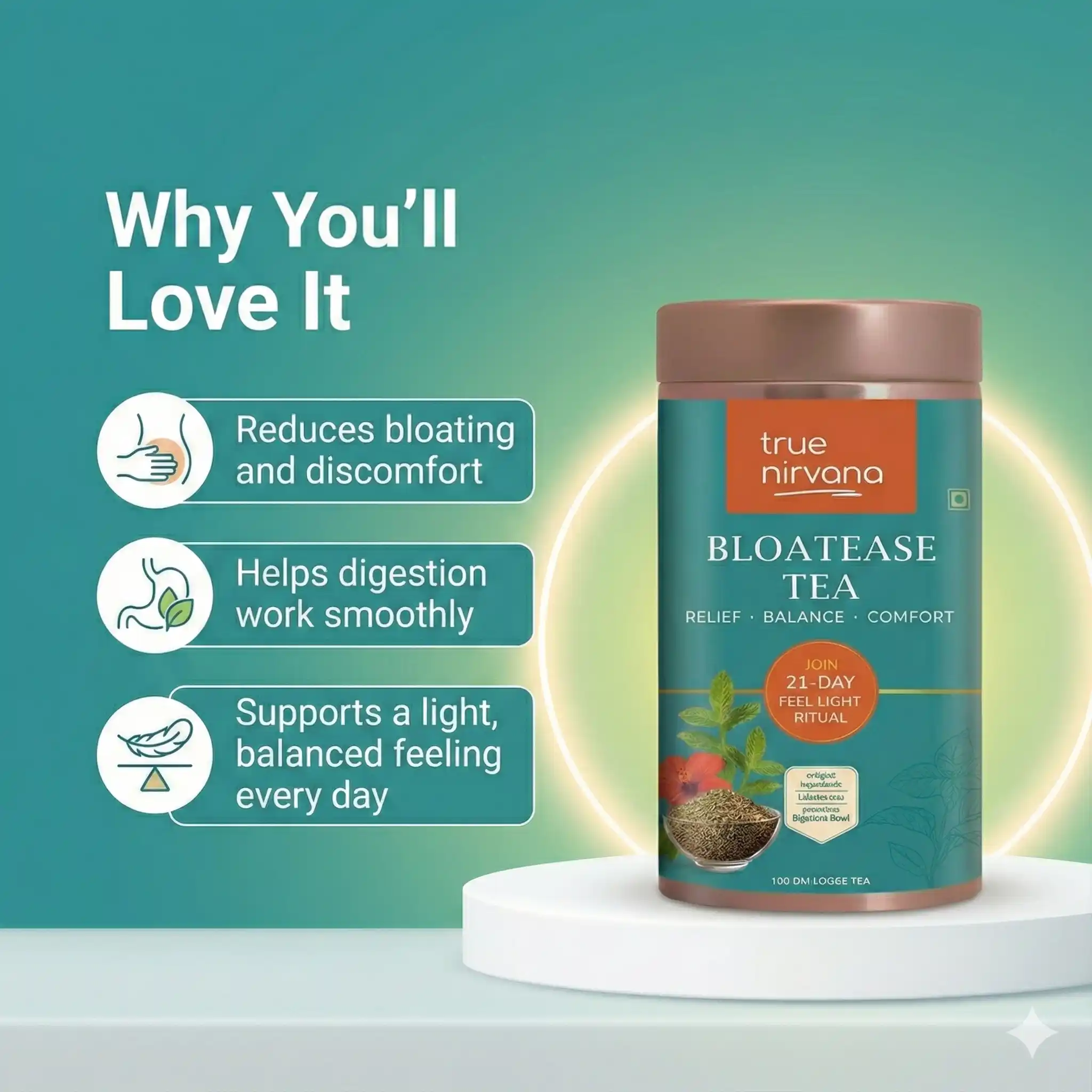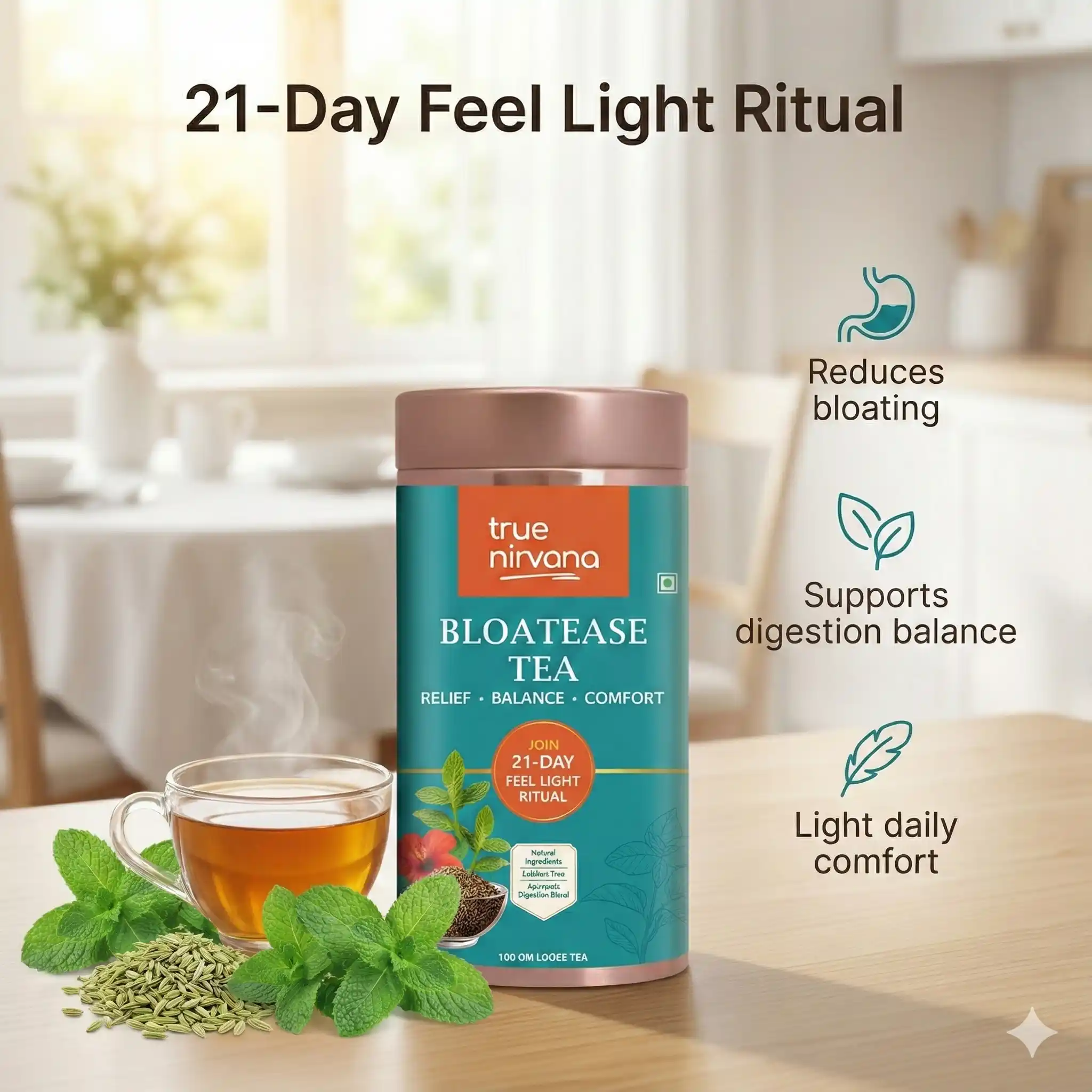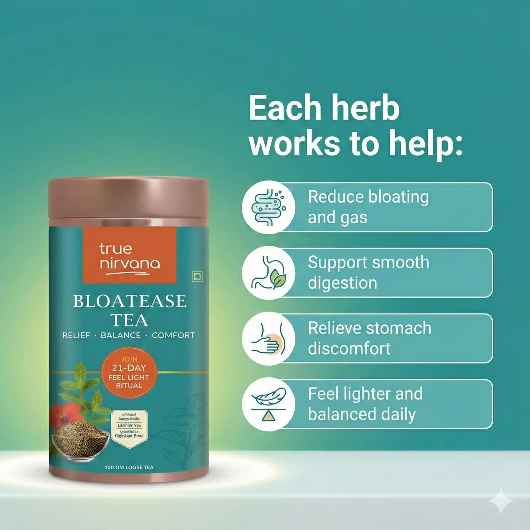 True Nirvana BloatEase Tea | Ayurvedic Digestive & Gas Relief Blend with Fennel, Ajwain & Ginger