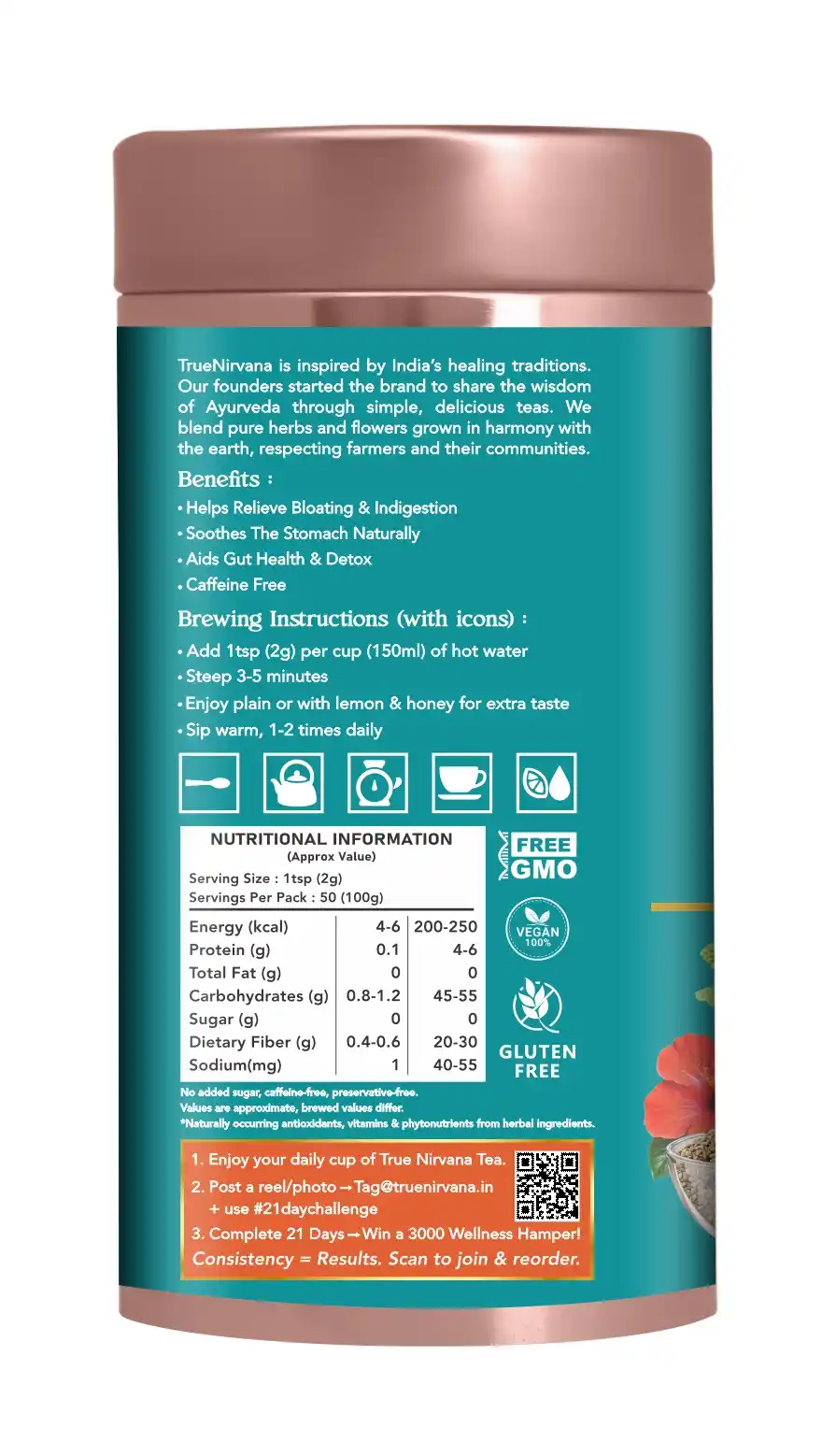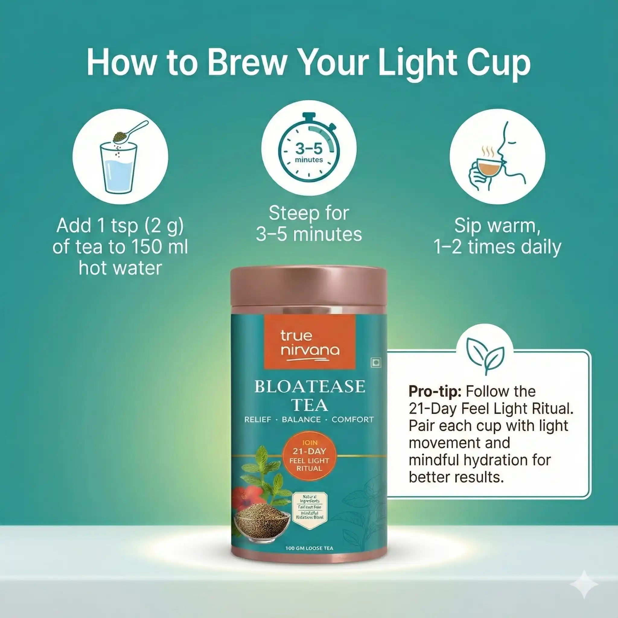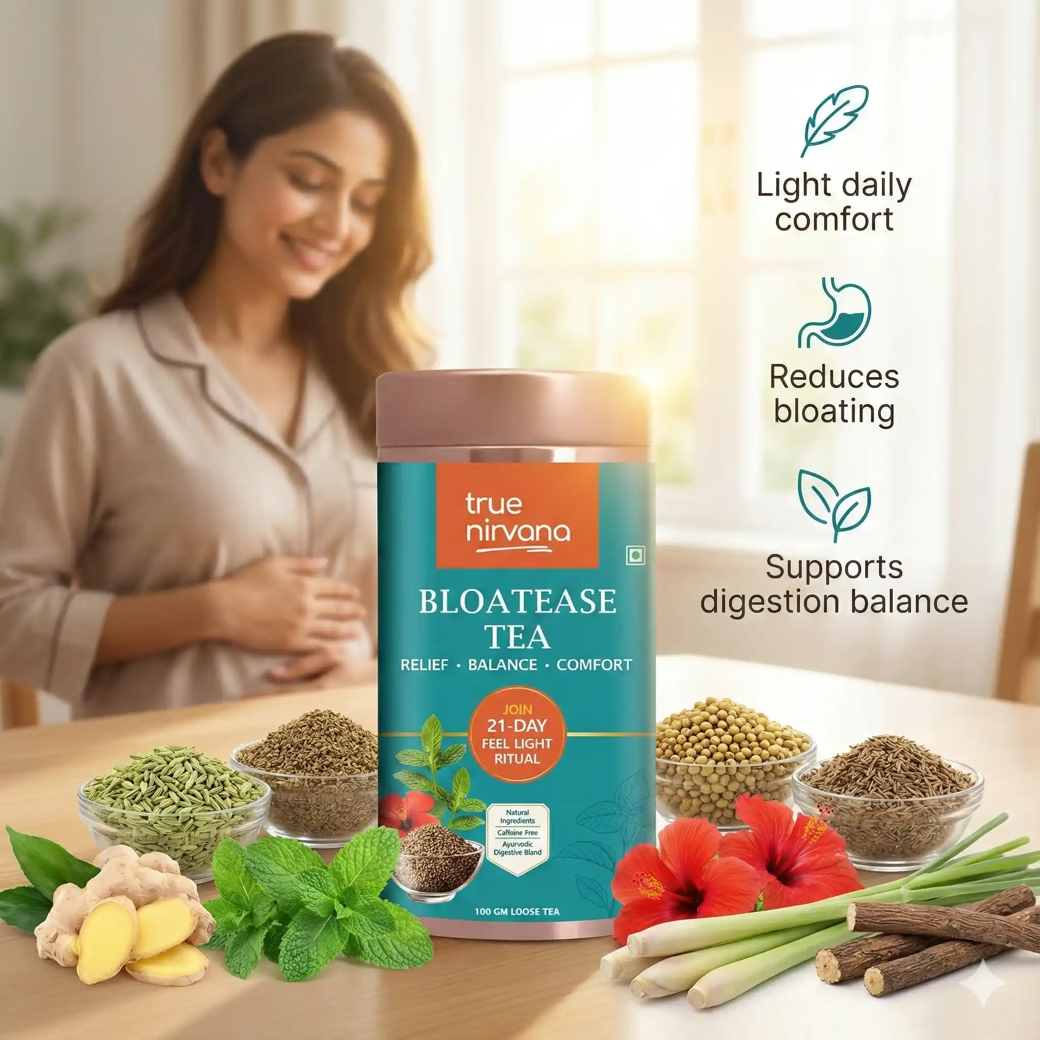 True Nirvana BloatEase Tea | Ayurvedic Digestive & Gas Relief Blend with Fennel, Ajwain & Ginger